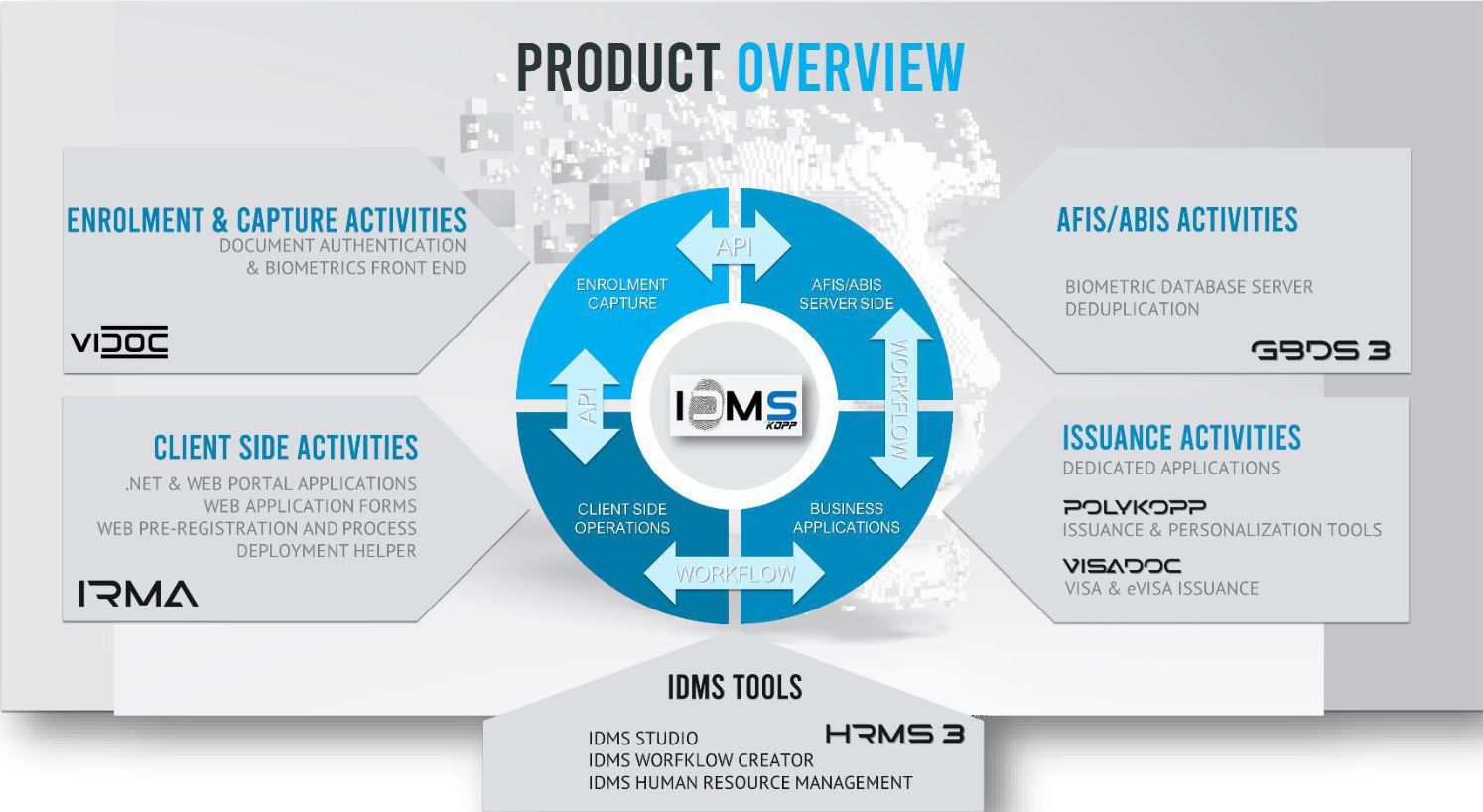 IDMS est à la fois un serveur de système de gestion d'identité et un générateur d'applications permettant de créer des applications de gestion d'identité, de gestion de titres sécurisés et de collecter des mouvements provenant d'applications tierces telles que le contrôle des frontières, les opérations électorales, la délivrance de visas électroniques.