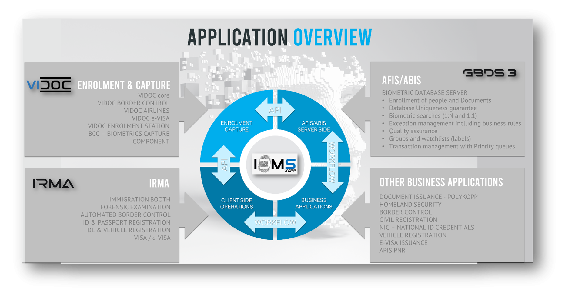 L'IDMS assure la gestion des bases de données ainsi que la distribution et la présentation de ces données aux différentes applications et services par le biais d'API REST authentifiées ou de tâches de workflow internes qui sont exécutées sous le contrôle d'un dispatcher et d'un scheduler. Par exemple : les données biométriques capturées sont transmises à AFIS/ABIS pour déduplication et, une fois définitivement validées, au module PolyKopp pour lancer l'impression du document sécurisé. IDMS peut fonctionner en service central ou en clusters partagés. Il gère également l'archivage des documents scannés lors du processus d'inscription ou d'enregistrement.